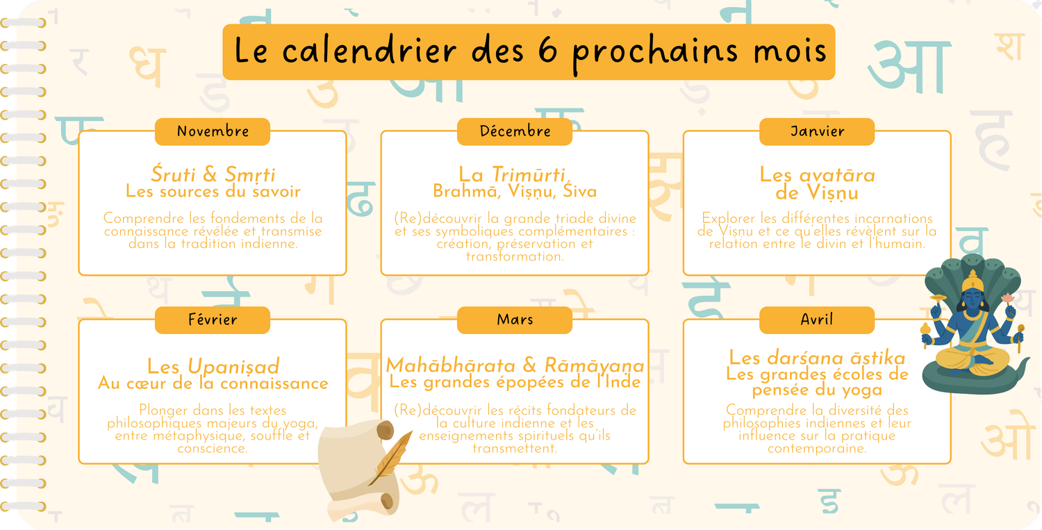Le yoga ne se limite pas aux postures, ni même à la respiration. Derrière chaque geste, chaque mantra, chaque souffle, se cache un monde de récits, de concepts et de symboles issus d’une tradition plurimillénaire. Et même si l'on en a conscience, c'est parfois difficile de trouver le bon format pour étudier toute cette sagesse sans se sentir perdu·e : des textes innombrables, des concepts complexes, des sources parfois contradictoires… par où commencer ? comment ne pas se perdre ? comment faire lorsque l'on ne peut pas y consacrer beaucoup d'heures dans le mois ?